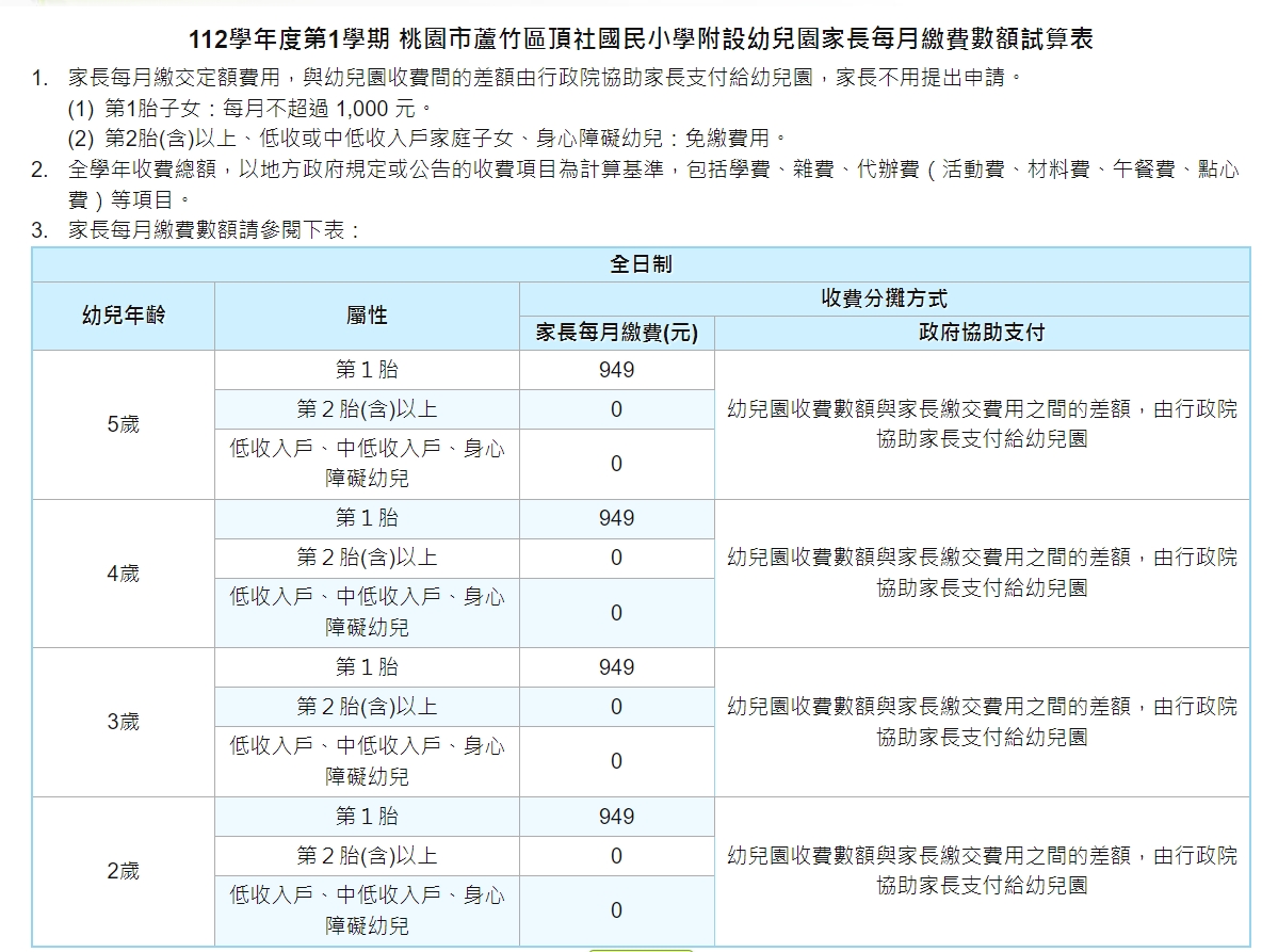 112學年度第二學期桃園市蘆竹區頂社國小附設幼兒園收退費數額表